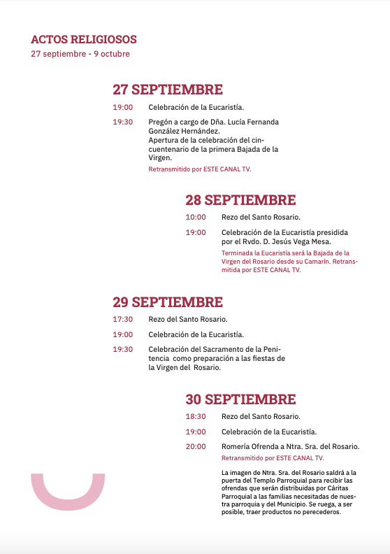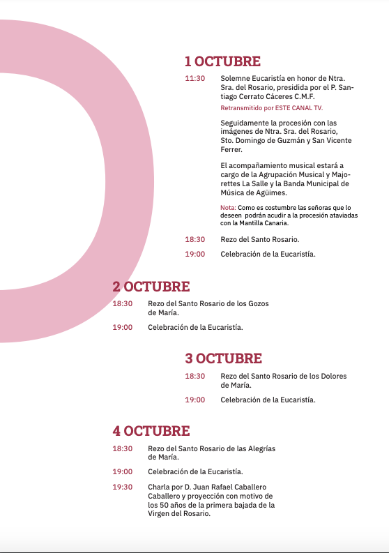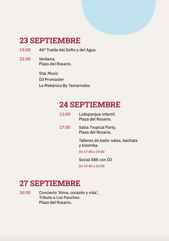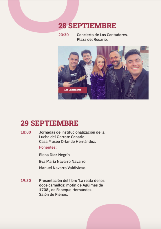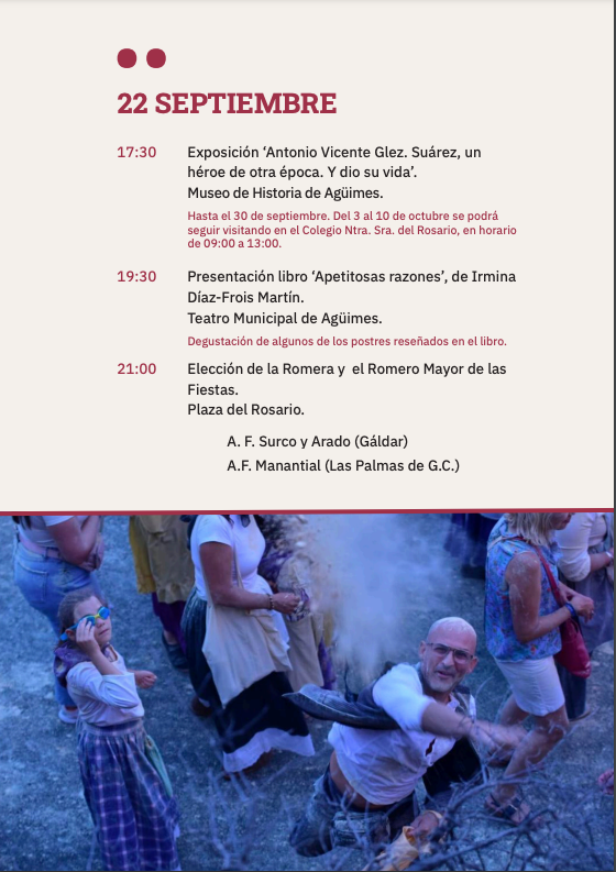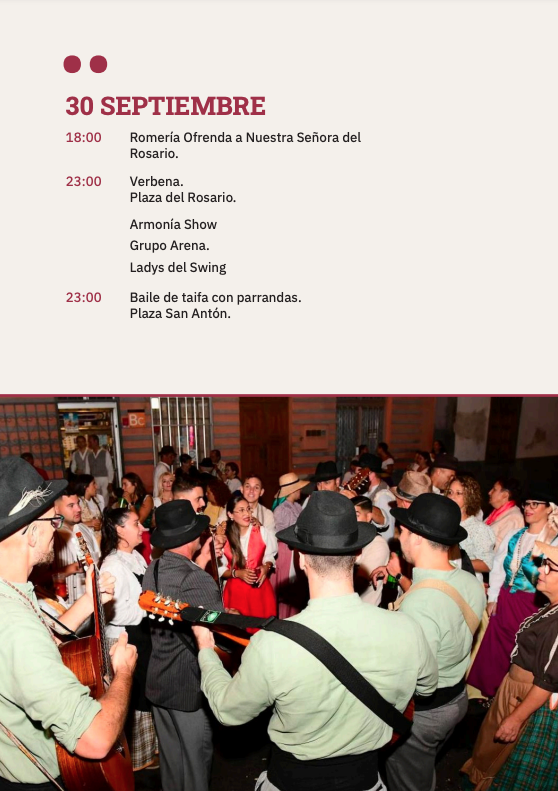 The festivities will take place from September 15 to October 9 and will include the Traída del Gofio, the Pilgrimage in honour of the Virgen del Rosario, the traditional Livestock Fair and the Gastronomic Days of the Canary Black Pig, among other activities.