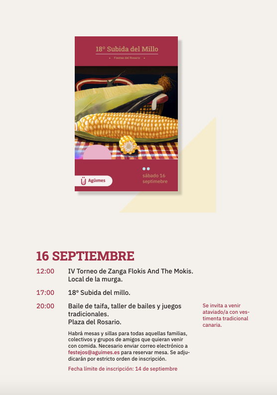 The Subida del Millo will start on Saturday 16 September, starting at 17:00, in the Plaza del Rosario, where young and old will meet to remember the old work of the fields. They will strip and shell the corn to later take the grain to the mills of Lolita and Ananías, on the way to Guayadeque, remembering the task that families of yesteryear carried out when they wanted to transform the millet they harvested into gofio. After complying with the custom, upon returning to the square you will be able to enjoy, starting at 20:00, the taifa dance to which you are invited to attend in traditional Canarian clothing.
