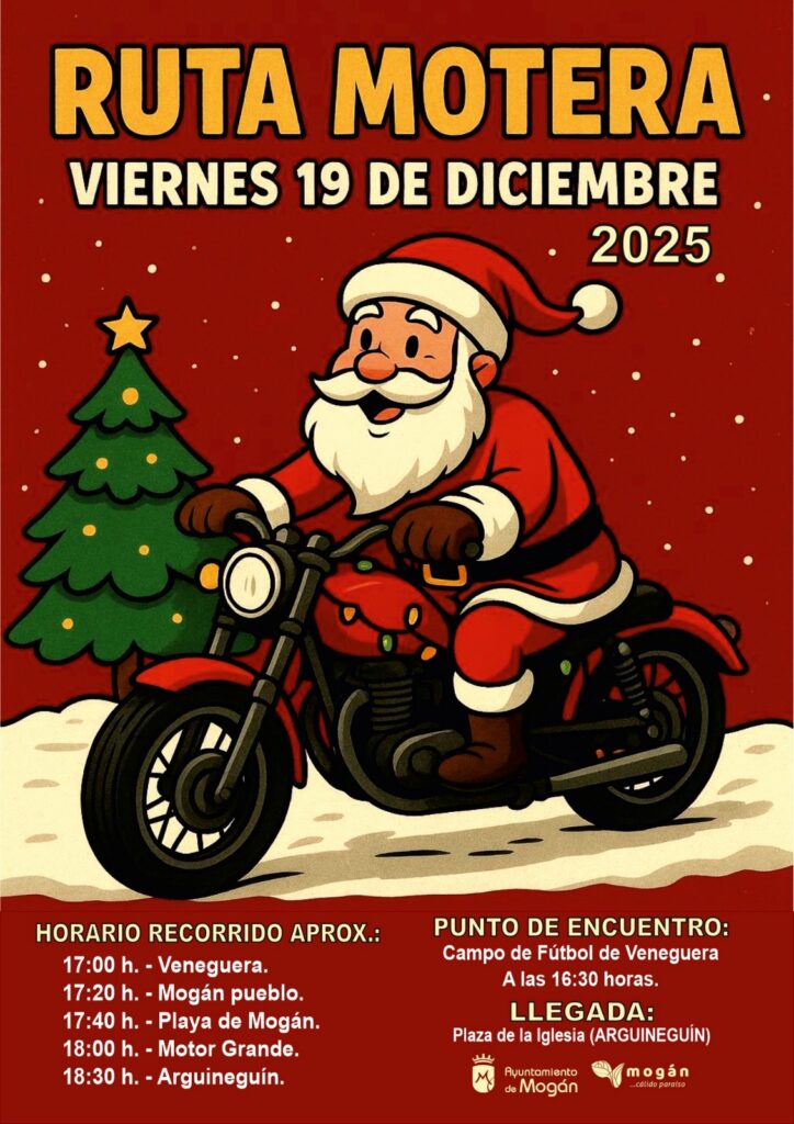Bikers’ Christmas Santa Parade in the municipality of Mogán will take place on Friday, December 19, 2025. The most festive route of the year arrives. Join Santa Claus on two wheels and enjoy the Christmas atmosphere throughout the municipality! ✨