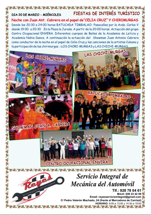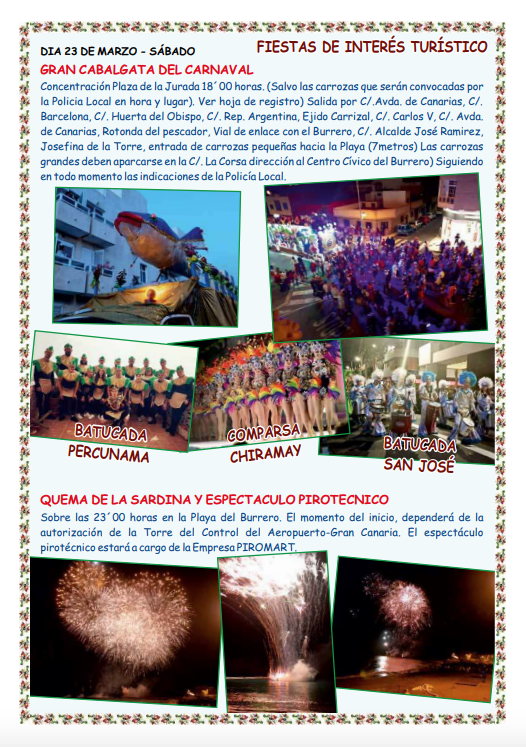The Rescue of the Sardine from 19:30 to 23:00 at Playa del Burrero: Tour of the streets, Luis Doreste Silva, Tomas Arroyo Cardoso, Mayor José Rámirez, Access road to the Jurada, Avda. de Canarias, Avda. Carlos V, C/ Sor Josefa Morales, Plaza del Buen Suceso, C/Rafael Martel, C/Cándida Ruano, Rotonda las Manos, C/Argentine Rep. C/Germany, C/Avda. Carlos V, Rotonda los Tomateros, C/Mijail Gorbachóv, Rotonda del Pescador, C/Avda de Canarias, returning to the Plaza de la Jurada.- Ending with popular grilled sardines accompanied by ambient music.