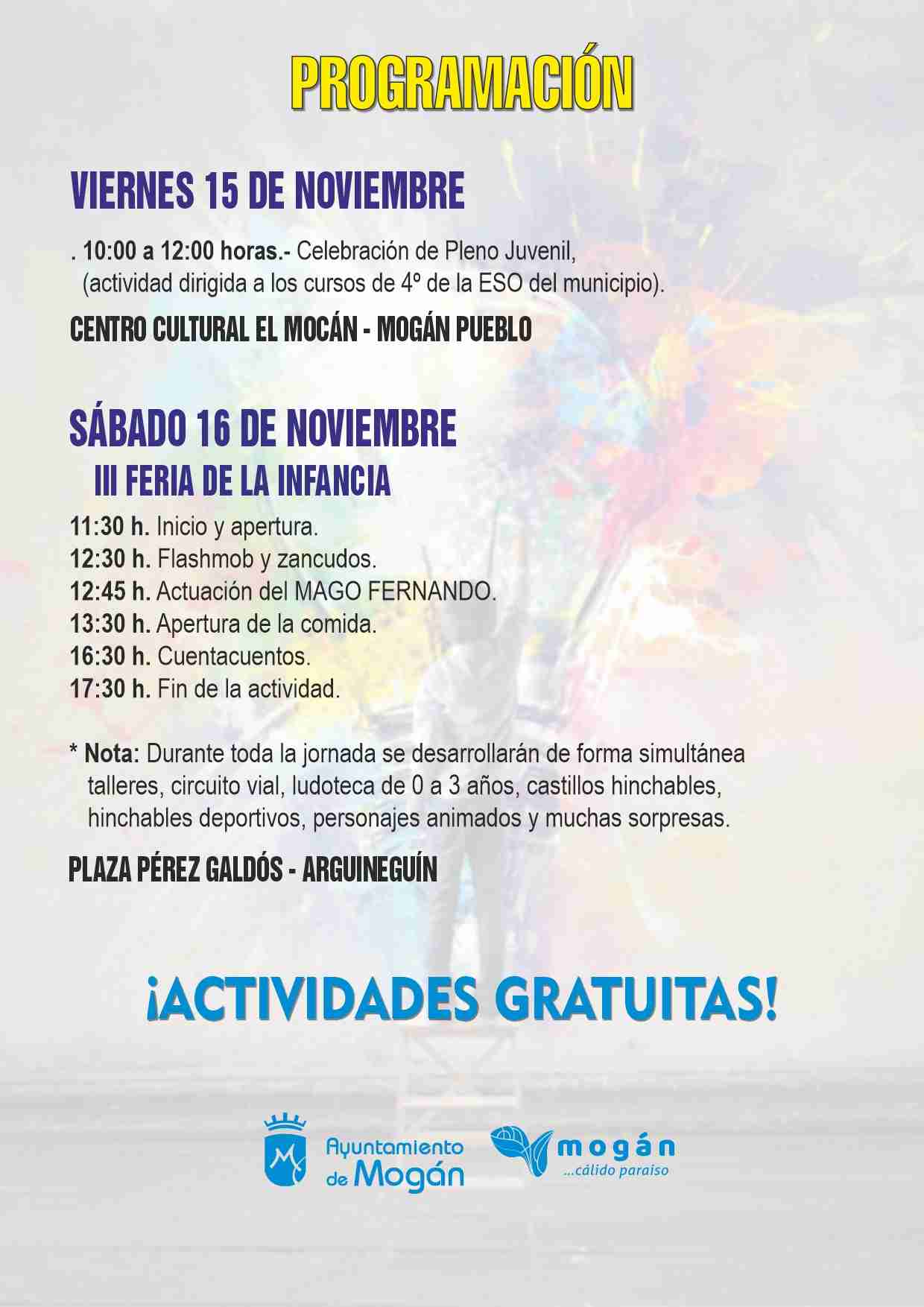 On Saturday 16 November, the Pérez Galdós square in Arguineguìn will be transformed from 11:30 to 17:30 into a fun-filled space with workshops, a road circuit for boys and girls, inflatables of all kinds and animated characters. In addition to all this, there will be a flashmob and the presence of stilt walkers, a performance by the Magician Fernando and a storytelling session. In addition, there will be a play area for children up to 3 years old and food will be offered.