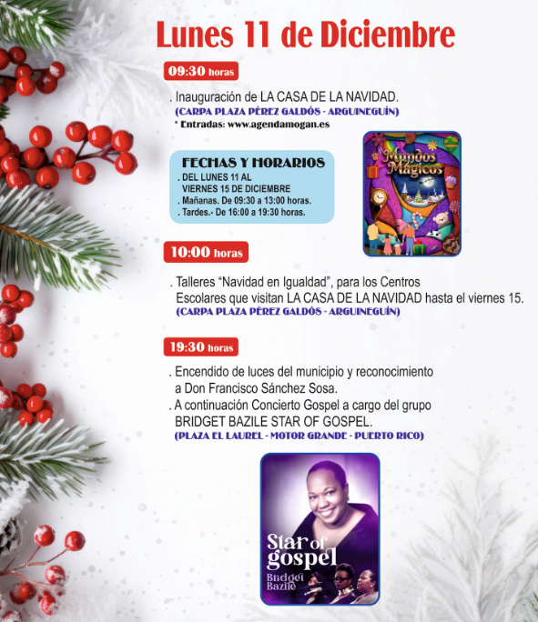 Switching on of its Christmas lights, followed by a Gospel Choir concert, will take place at Plaza El Laurel in Motor Grande, Puerto Rico de Gran Canaria.