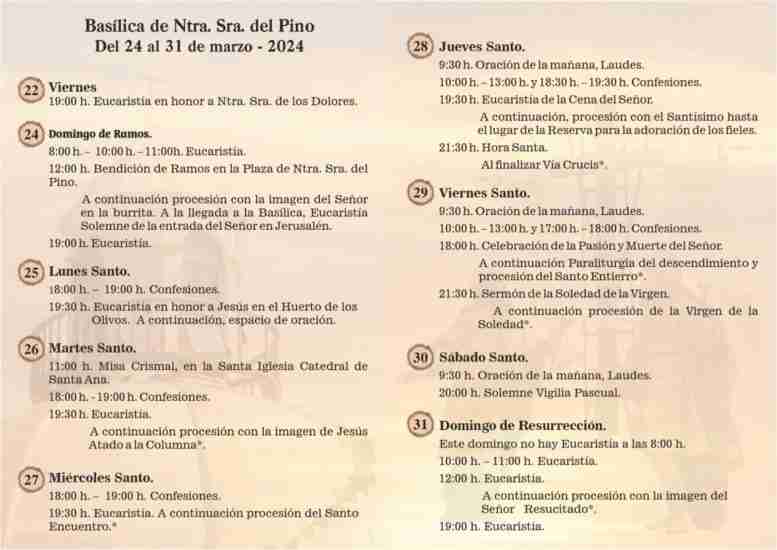 Religious eucharist during the morning, in the church of Our Lady of the Pine, at 08:00/10:00/11:00, followed by a blessing at 11:45 at the Plaza of the Church.