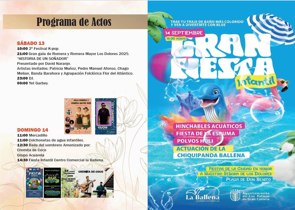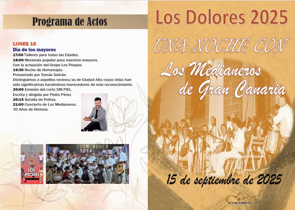 The festivities in honour of Nuestra Señora de Los Dolores in the Schamann district (Ciudad Alta) in the capital, Las Palmas de Gran Canaria. The main events are celebrated between 12-22 September 2025. A wide program of activities for all audiences and the epicentre for the festivities will be Plaza de Don Benito.