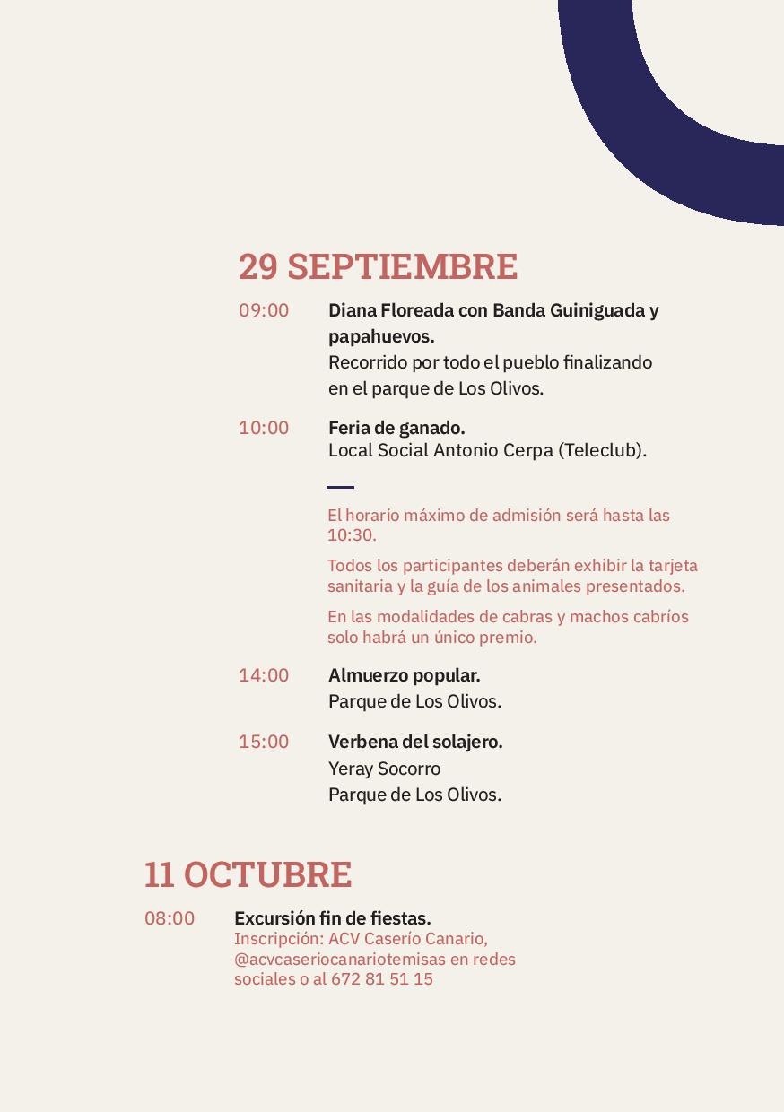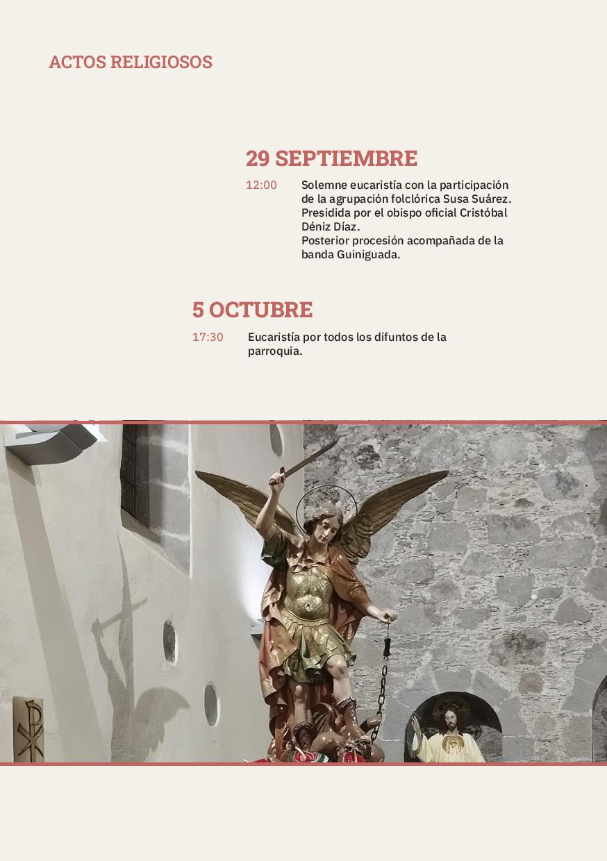 There will be no shortage of music with street parties in the square and park, featuring artists such as Paco Guedes, Hierba Mala, Pepe Benavente, and Grupo Arena. This year, a Hi-Fi Ladder will also be held, themed around “La Tele Canaria.” The main day will be September 29th, the feast of San Miguel Arcángel, which begins with the Diana Floreada (Flowered Diana) parade through the town streets and continues with the Eucharist, a procession, and a communal luncheon in Los Olivos Park. The day will conclude with the traditional livestock fair and the Solaje festival, culminating in a celebration that combines tradition, devotion, and joy.