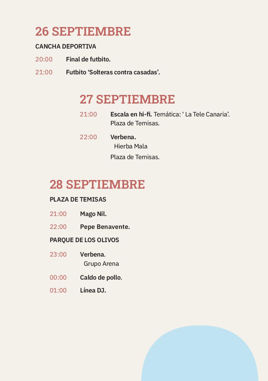 On Saturday, the 20th, the Romería (pilgrimage offering), one of the most anticipated events, will begin in Tarilla and conclude at the plaza, culminating in a street party in Los Olivos Park. The program also includes children’s activities, such as a foam and inflatable party on September 21st, a traditional dance for adults accompanied by a snack of churros and hot chocolate on September 25th, and a zanga, lotería, and dominoes tournament on September 23rd and 24th.