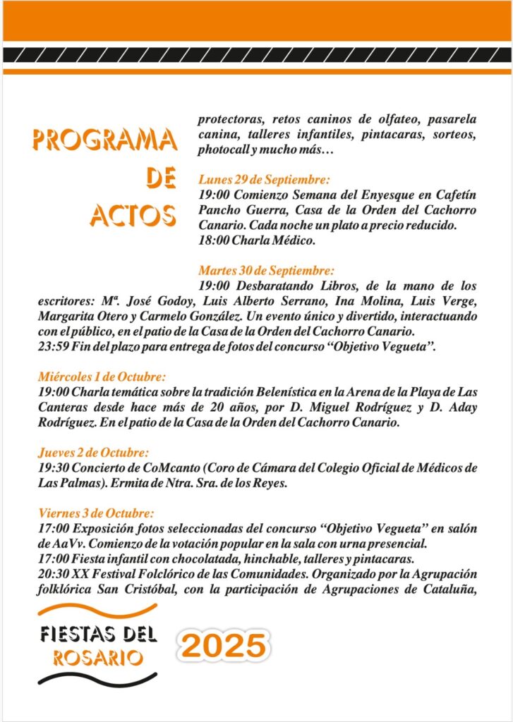 12:00 Procession of Ntra. Mrs. del Rosario accompanied by Parrandas Canarias. Procession leaving from the church of Santo Domingo de Guzmán to continue through the streets García Tello, Católicos Reyes, Hernán Pérez de Grade, Paseo de San José and Sor Brígida Castelló to the parish in the Plaza de Santo Domingo.