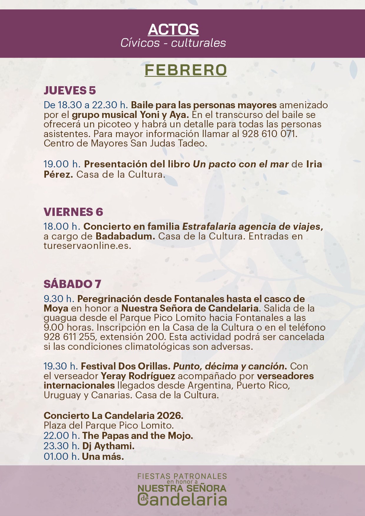 These festivities reflect the welcoming spirit and cultural identity of the town of Moya in honor of Our Lady of Candelaria, so that everyone can enjoy them.