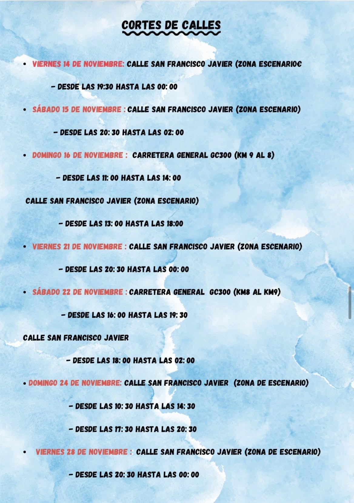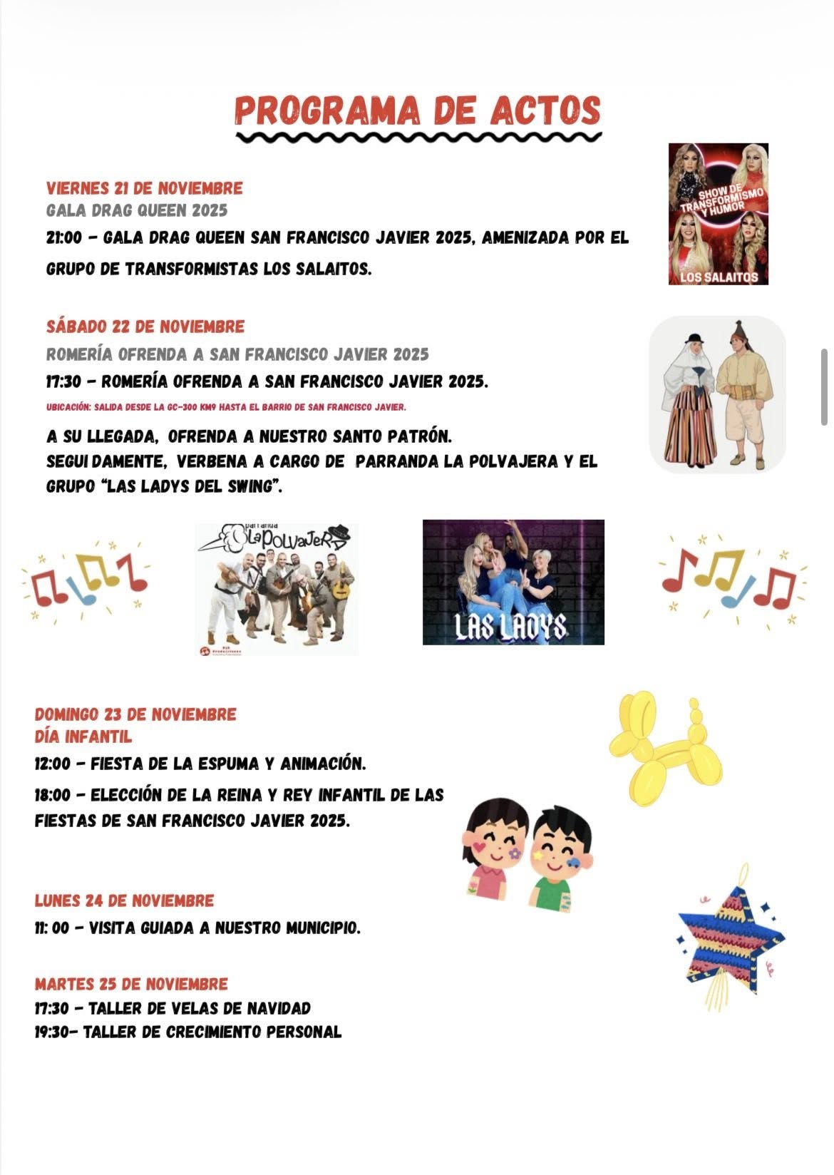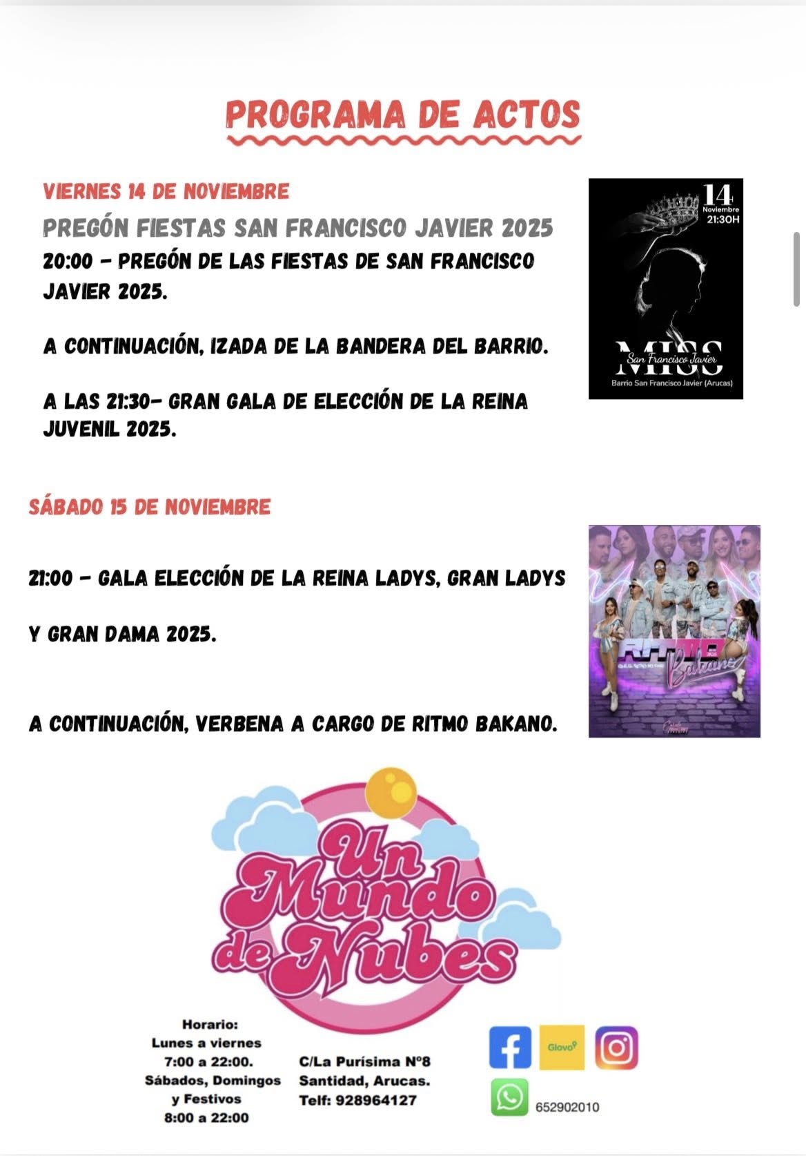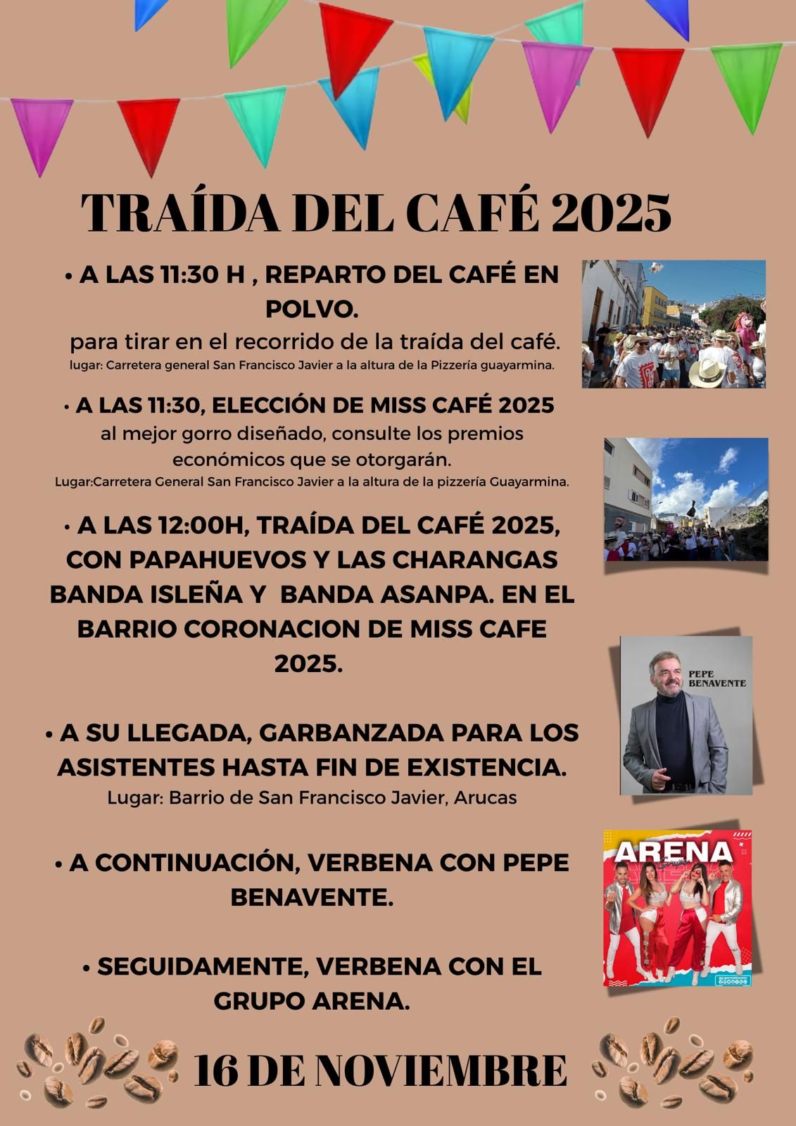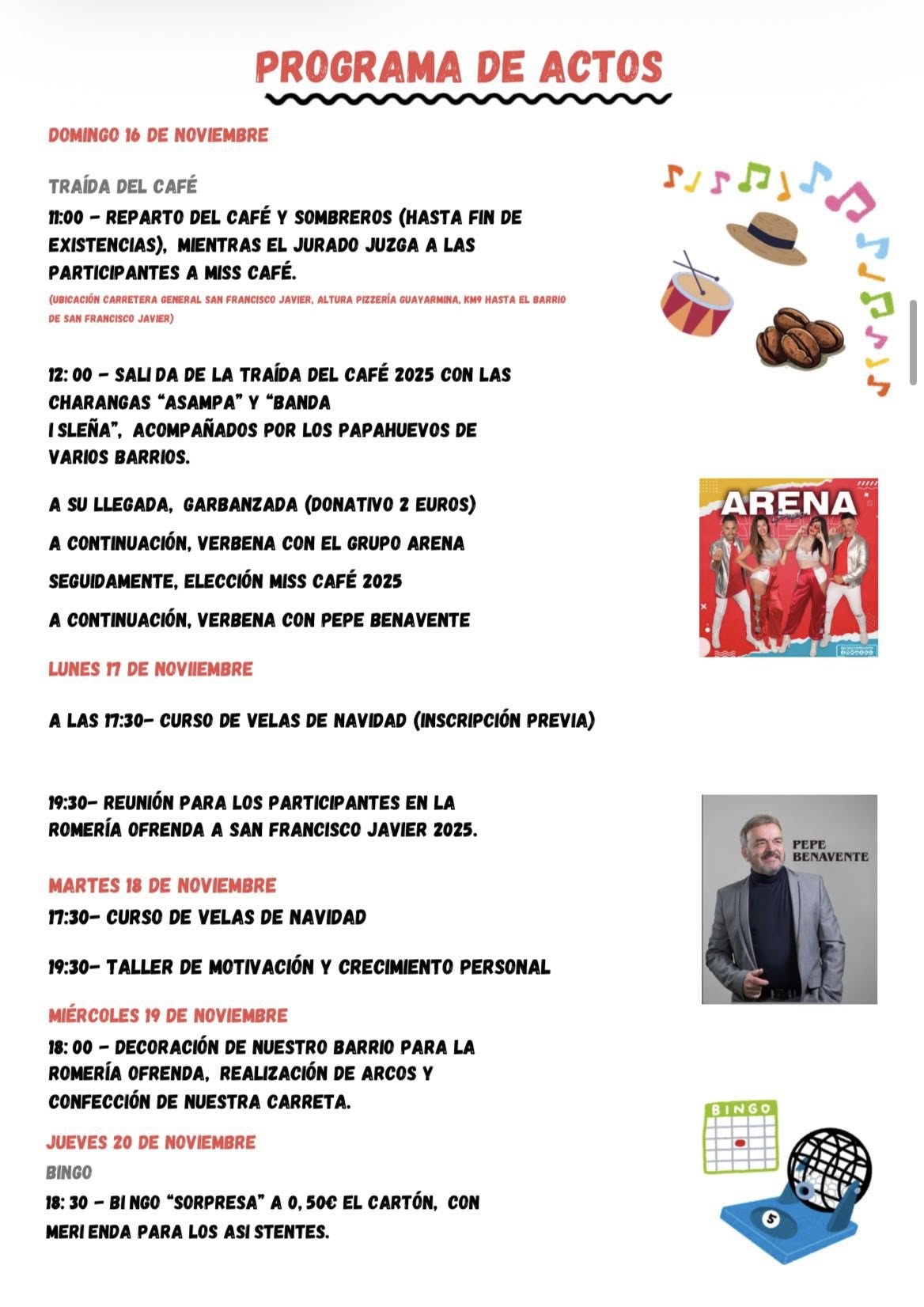 The neighbourhood of San Francisco Javier (on GC-300) in the municipality of Arucas is celebrating their patron saint festivities in honour of San Francisco Javier between 14 November – 6 December 2025. The main feast Day is Sunday, 30 November 2025. Another special festive day is “Traída del Café” on Sunday, 16 November.