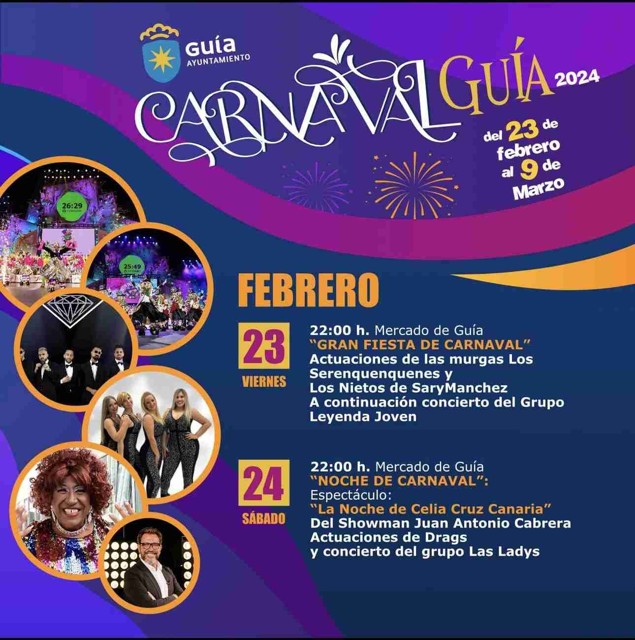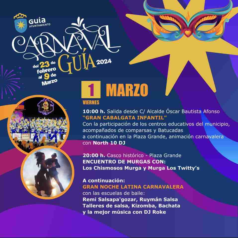 Santa Maria de Guía Carnival is celebrating carnival between 23 February – 9 March 2024. The festivities will feature this year for the first time with the Guía Market as the host space for the first weekend of the carnivals. In its facilities, the starting signal will be given on Friday the 23rd with a ‘Great Carnival Party’ with the performance of various murgas and a music concert.
