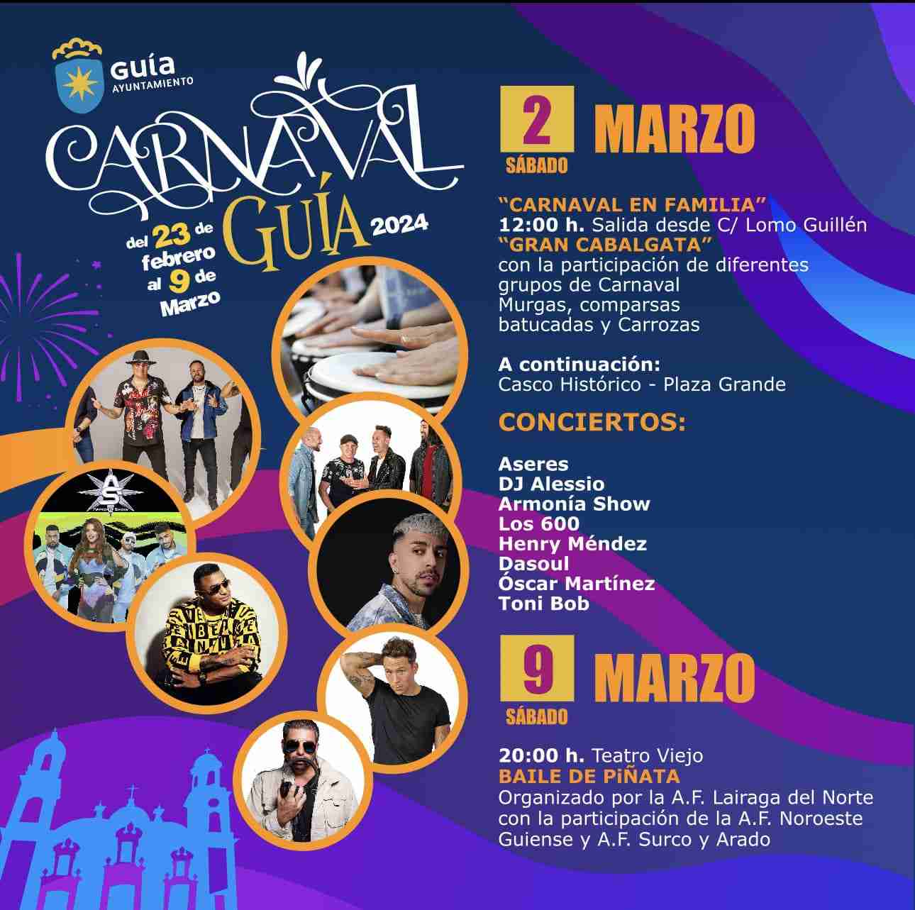 at 12:00 The ‘Great Family Carnival’ with a Great Parade that will depart from Lomo Guillén until reaching the front of the Church where the party will continue with the celebration of several concerts by Canarian and national groups; Aseres, DJ Alessio, Armonía Show, Los 600, Henry Méndez, Dasoul Óscar Martinez, Toni Bob