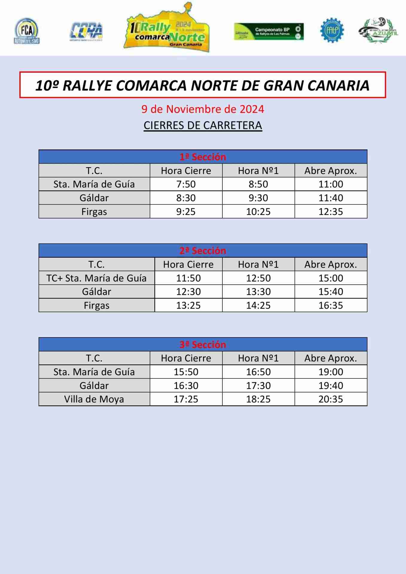 The sections are “Santa María de Guía” (Casas Aguilar-Santa Cristina-Los Tilos-Corvo) of 14.35 km, which will be contested at 8:50, 12:50 and 16:50; “Gáldar” (Monte Pavón-Lomo El Palo-Fagajesto) of 11.82 km, at 9:30, 13:30 and 17:30 h; and “Firgas” (Los Dragos-Azuaje) with 6.75 km, at 10:25 and 14:25 h. The first two will be repeated three times and the Firgas will be a double pass, since the third becomes a shorter version called “Villa de Moya” of 4.74 km (Los Dragos-El Lance-El Solís), the last section to be done at 18:25 h.