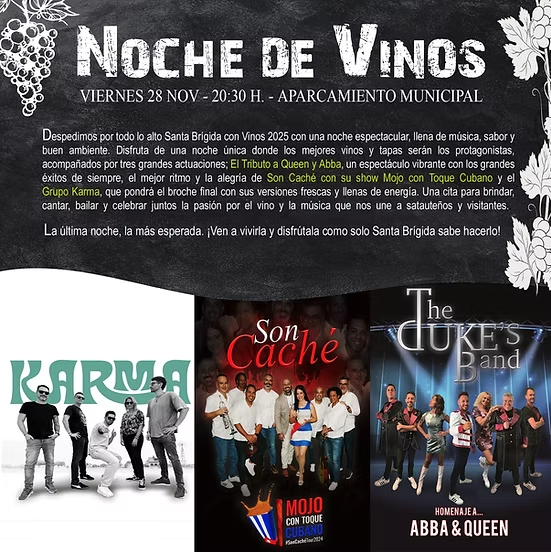 20:30 – 01:30 Santa BrĂgida parking lotWe bid farewell to Santa BrĂgida con Vinos 2025 in style with a spectacular evening, full of music, flavor, and a great atmosphere. Enjoy a unique night where the best wines and tapas will be the stars, accompanied by three great performances: The Queen and Abba Tribute, a vibrant show featuring classic hits; the best rhythm and joy of Son CachĂ© with their show “Mojo con Toque Cubano”; and Grupo Karma, who will put the finishing touches with their fresh and energetic versions.A date to toast, sing, dance, and celebrate together the passion for wine and music that unites us, Satauteños and visitors.