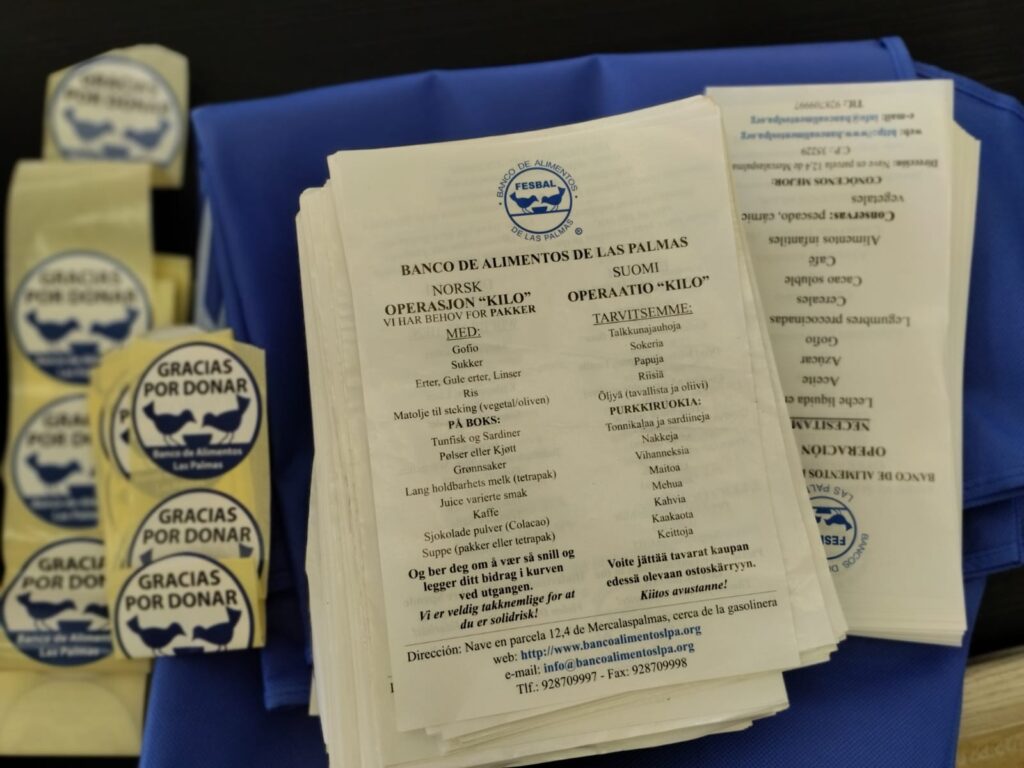 Please purchase an extra ítem of food and leave it in the box placed at the exit of Alcampo, Aldi, Carrefour, El Corte Ingles, Hiperdino, Lidl, Makro, Mercadona, Spar, Supermercados Padillas, Supermercados Bolaños. etc… Foods most required are milk (UHT), vegetable or olive oil, tins of tuna, sardines, corn, spam, sausages, tomato paste, breakfast cereals for children, chocolate milk powder, juice, biscuits, baby food, flour, gofio, sugar, coffee, etc…. The best Brand is CHEAP HOUSE BRAND!